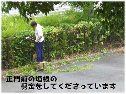 いつも学校の環境整備や学校園(畑)の手入れ等でお世話になっている,中山団地にお住まいの浦上さんが,ボランティアで暑い中,お一人で剪定してくださっています。