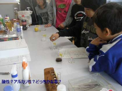 6年生は理科で「水溶液の性質」の学習をしています。リトマス試験紙の学習をした後,今日は身近にある水溶液の性質について調べました。酸性?アルカリ性?それとも中性?子ども達は予想を立てながら意欲的に実験していました。