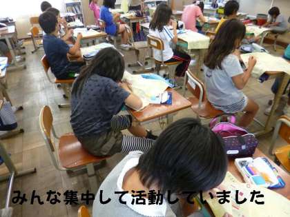 5年生は,家庭科で裁縫学習が始まっています。今日は2回目?針に糸を通して,「玉結び」「玉止め」の練習です。