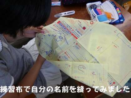 練習布を使って,自分の名前を縫ってみました。でも最後の「玉止め」が難しく,四苦八苦していました。