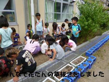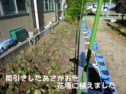 そして,間引きした「あさがお」は,捨てずに中庭の花壇に植え替えました。みんなで花壇の雑草を抜いて,夏に向けて,「あさがお」の緑のカーテンを作ります。