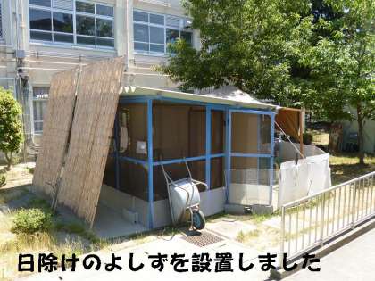 先日,屋外飼育場にテントを張ってやりましたが,西側の小屋の中の日除けのため,「よしず」も設置してやりました。