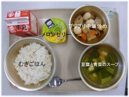 「むぎごはん」「豆腐と青菜のスープ」