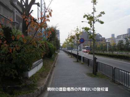 学校西側の外環歩道にも晩秋の気配を感じます。でも登校時間になったら,なぜか活気づきます。やがて葉が落ちてなくなってしまう木々も,子どもたちから元気をもらっているようです。