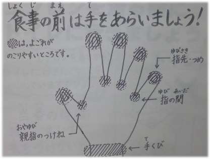 手には,目に見えない菌がついています。手洗いの時には,石けんを使って,特に指先・つめ・親指のつけね・指と指の間・手首をしっかりと洗いましょう。