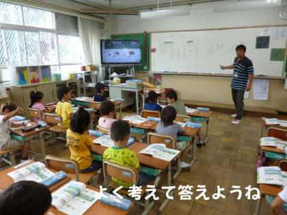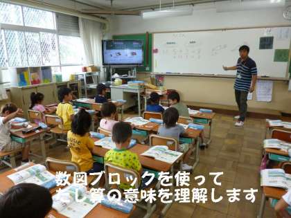 子どもたちが理解できるように,絵を使ったり,数図ブロックを使ったりして授業が進んでいます。