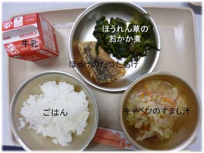 「ほうれん草のおかか煮」「ほっけのたつたあげ」