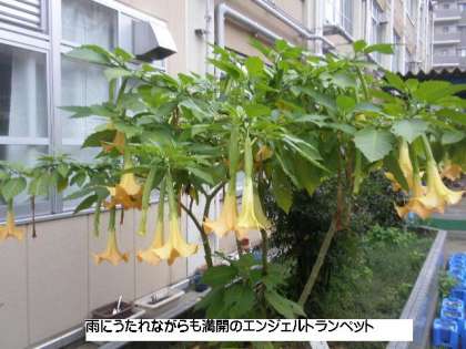 以前にも紹介しましたが,中庭の花壇に「エンジェルトランペット」が植えてあります。今季2度目の満開です。「木立朝鮮朝顔」の別名ですが,雨にうたれて鮮やかに咲いています。1か月以上前に満開になり一度花が落ちてから,また咲き始めました。