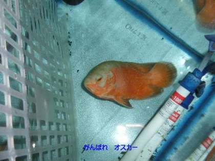 保健室前の熱帯魚「アルビノオスカー」が餌を食べなくなって2か月,横向けになって1か月・・・!普通だったら,横向けになったらまず助からないと思うのですが,がんばって生きています。