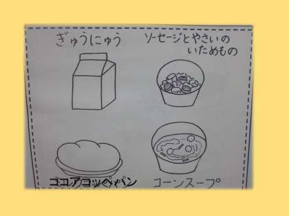 「コーンスープ」「ソーセージと野菜の炒め物」「牛乳」