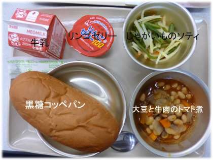 「黒糖コッペパン」「大豆と牛肉のトマト煮」
