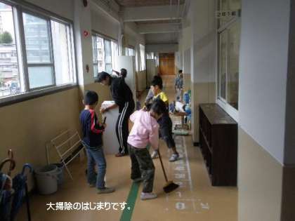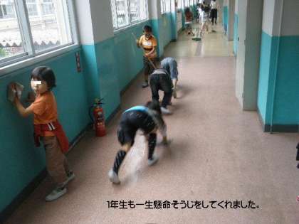 本日予定されていた4校合同クリーンキャンペーンは雨天のため中止になりました。そのため,各校で校内大掃除に切り替えました。本校では,給食中に放送で校長先生からのお話を聞いたあと,普段の掃除をし,そしてさらに時間を取って各教室の隅々までほこりやゴミをなくそうと大掃除タイムを持ちました。PTAのお母さん方にも来ていただき一緒にがんばりました。
