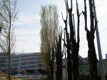 数年間、伸び放題だった「けやき」や「ポプラ」の木は防球ネットの高さをはるかに越えて困っていました。