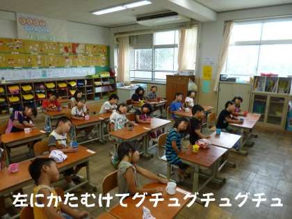 虫歯予防のため,本校は「フッ化物洗口」を実施していますが,金曜日は1年生が朝の会でやりました。