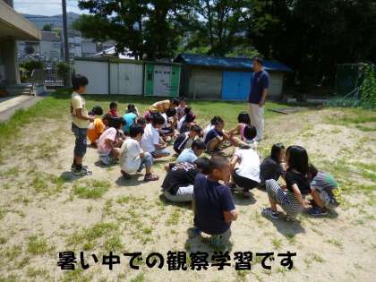 前回よりツルが何センチのびたか?葉の数は?など,炎天下の暑い中でしたが,班ごとに観察しました。