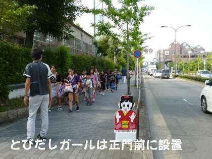 昨日,正門前にドライバーに注意を呼びかける「飛び出しぼうやと飛び出しガール」を設置しました。