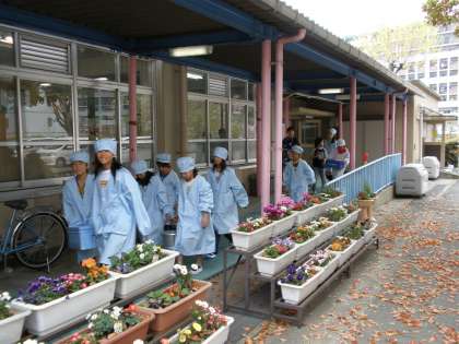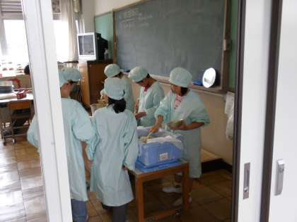 低学年は黄色、中学年はうす緑、そして高学年は青と色分けもしていただき、とてもカラフルで衛生的で格好いいエプロンになりました。