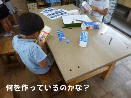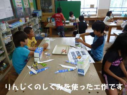 今日は,牛乳パックを使って土台を作り,りんじくになる竹ひごを取りつけました。