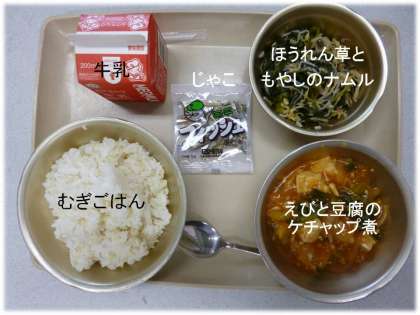 「むぎごはん」「えびと豆腐のケチャップ煮」