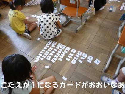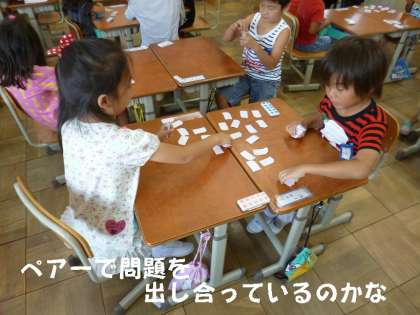 8−7は? 2+5は?・・・カードに書かれた計算をして,同じこたえどうし並べました。また,ペアになって計算問題を出し合っていました。