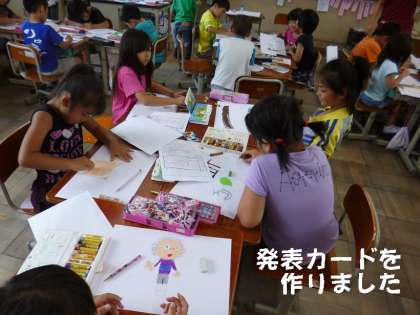 校区たんけんで見て・さわって・聞いて発見したことを,1年生に発表します。その発表カード作りに取り組みました。