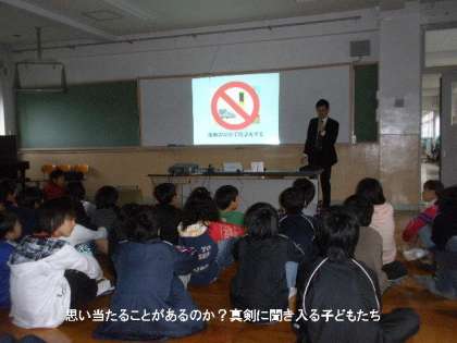 子どもたちの多くが自分の携帯をもっていますが,危険なメール等の説明の時は,思い当たることがあるのか、真剣に聞き入っていました。