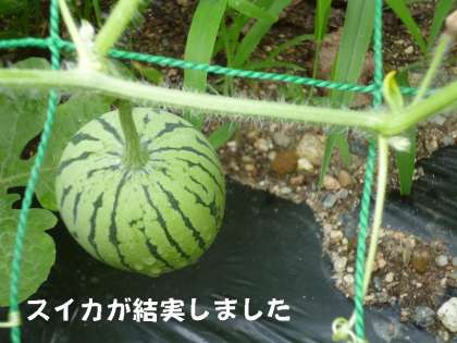 野菜畑の「すいか」が結実しました。まだ野球のボール程度の大きさですが,これから約1ヶ月後の収穫までに,大玉のすいかに成長してくれたらいいのですが。