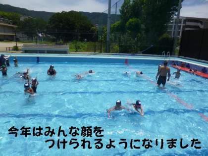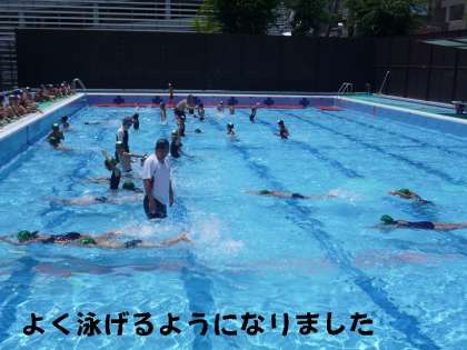 よく泳げる子も泳げない子もプールに入ることは大好きです。何度も何度もプールを横向きに泳いで往復していました。
