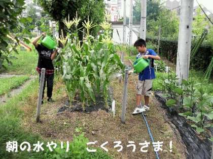 朝,登校後すぐに当番の子どもたちが,野菜畑に行って水やりをしてくれています。