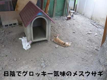 ウサギたちは,屋外飼育場の日陰を見つけて寝そべっています。暑さで少々グロッキー気味です。