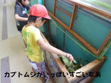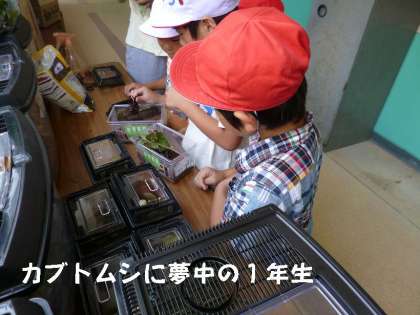 中間休みになると,数人の1年生がカブトムシを見にやってきます。ちょうどえさのゼリーを取り替え中だったので,直接カブトムシをさわらせてもらいご満悦でした。