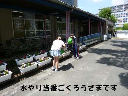 環境委員会の子どもたちは,プランターの花の水やりを担当しています。