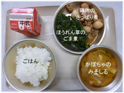 「ごはん」「かぼちゃのみそしる」「ほうれん草のゴマ煮」