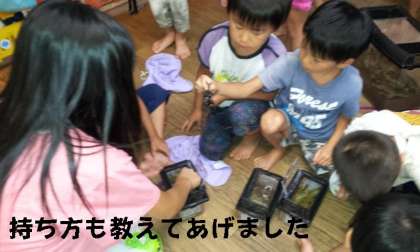 保育園では,園児たちにカブトムシの持ち方などを教えてあげました。とても喜んでいる園児たちを見て,子どもたちも満足していました。