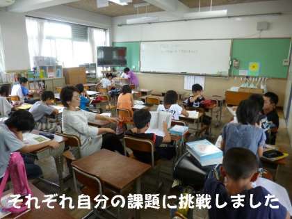 4年生は,教室いっぱいになるぐらい参加してくれました。先生にアドバイスを受けながら自由勉強のまとめをする子どもたちもいました。