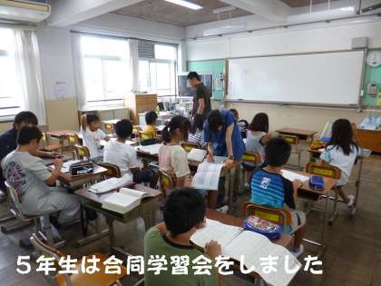 5年生は,1組2組合同での学習会です。個々の課題プリントや自由研究のまとめをがんばっていました。