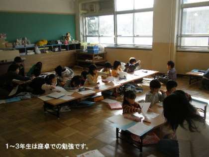 今日の土曜学習は,生活科ルームで座卓でおこなっています。先生やお手伝いのお母さんとで4名体制で個々に合った課題を学習中です。