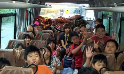 外は雨ですが,バスの中は元気な声であふれています。