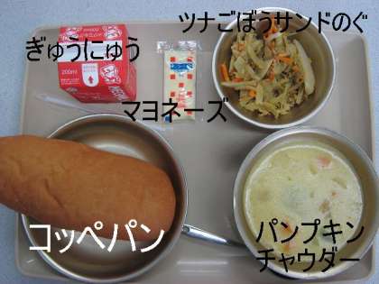 今日は,コッペパンに具をはさんで,ツナごぼうサンドにして食べました。パンプキンチャウダーとよく合っていて,おいしく食べられました。