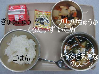今日は,くろだいずが付いていました。プリプリちゅうかいためは,たくさんの具が入っていて,とてもおいしく食べられました。