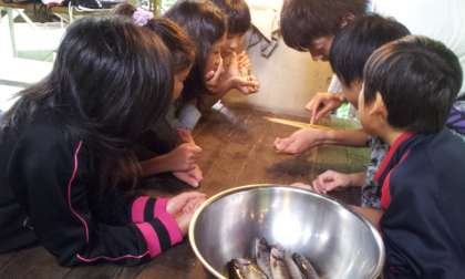 魚つかみで捕まえた「あまご」の内臓を竹串で取り出すことに挑戦中です。