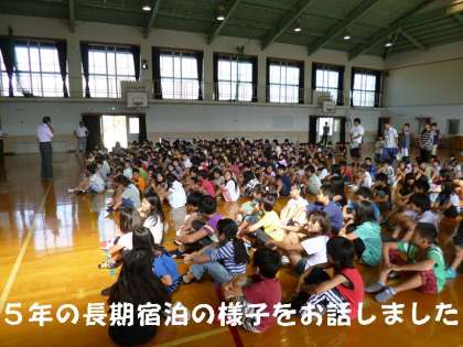 校長先生から,5年生の「長期宿泊・自然体験学習・5泊6日」の話と心が通う「二言あいさつ」の話がありました。