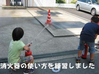 醍醐消防分署では,職員の方から話を聞いたり,実際の消火訓練を見学させてもらったりしました。消火器を実際に使って,使い方も学習しました。