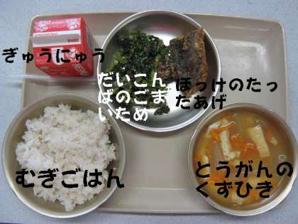 「むぎごはん」「ほっけのたつたあげ」「だいこんばのごまいため」