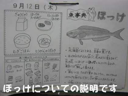 今日は,給食カレンダーにほっけの説明がのっていました。たんぱく質やカルシウム,ビタミンDが多く含まれているそうです。