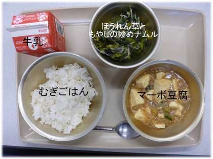 「むぎごはん」「マーボ豆腐」「ほうれん草ともやしの炒めナムル」