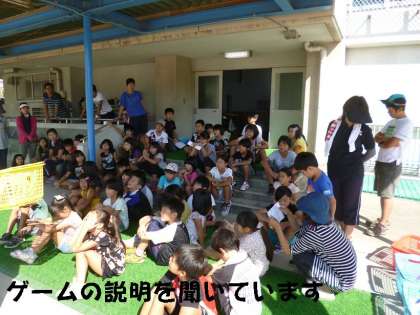 最初は,子どもたちと保護者,先生たちで「イニシアティブゲーム(アニマルしりとり)」そして,ネイチャーゲーム(カムフラージュゲーム)」でスタートしました。