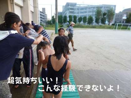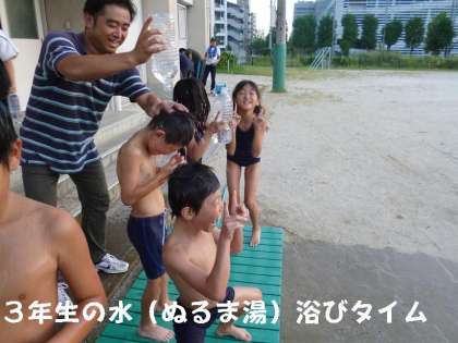 今日はとても暑い日になったので,夕方に3年生は水(ぬるま湯)浴びをして汗を流しました。こんな経験はめったにできないと,キャーキャー言って喜んでいました。