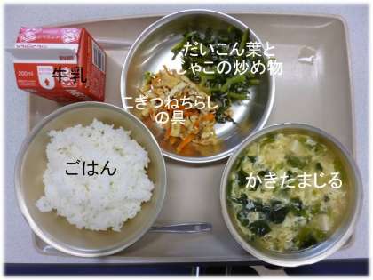 「ごはん」「かきたまじる」「だいこん葉とじゃこの炒め物」
