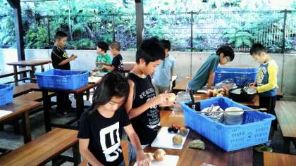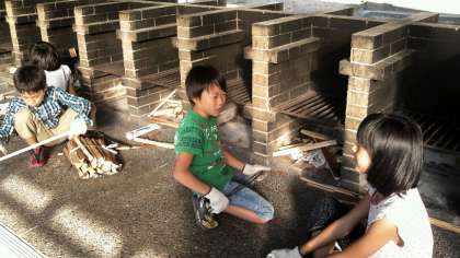 子どもたちは,かまどに火をつけたり野菜を切ったりお米を研いだり…